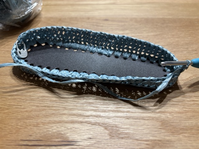 横向きにスマホを入れるとすっぽり収まり、スマホと鍵を入れるだけなら、この高さでも充分ですが、わたしは財布なども入れたいと思い、もう1玉分編むことにしました。