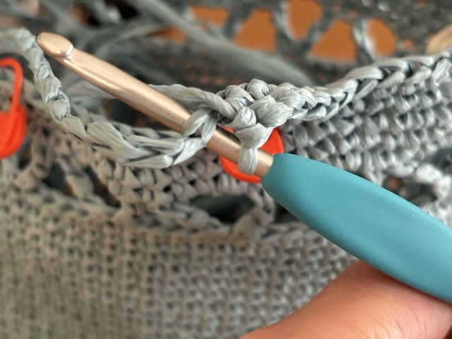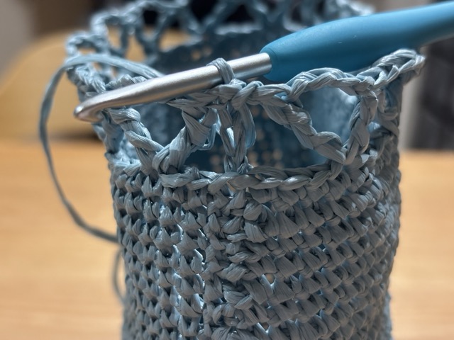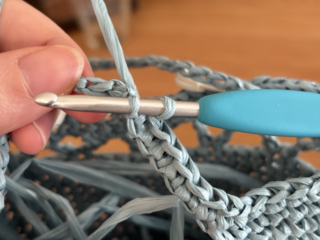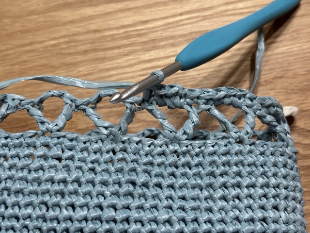 11目めまでこま編みで編み進め、12目めからくさり編みを20目編み、取っ手部分を作ります。