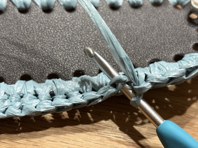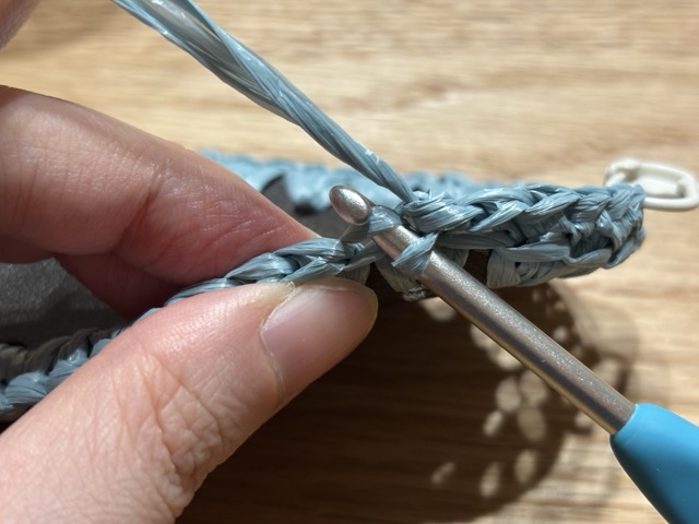 底板を編みつけたときと同様に、Dカンの中に針を通し編みつけます。